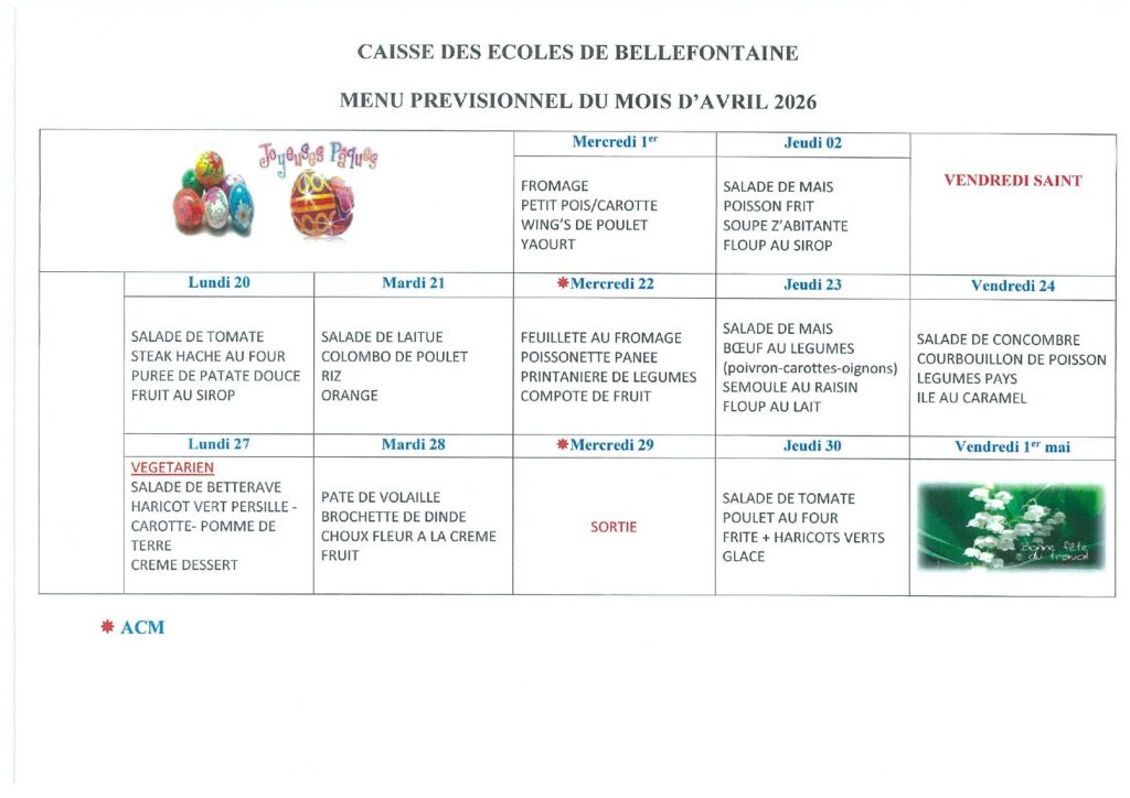 Restaurant scolaire – Menu avril 2026