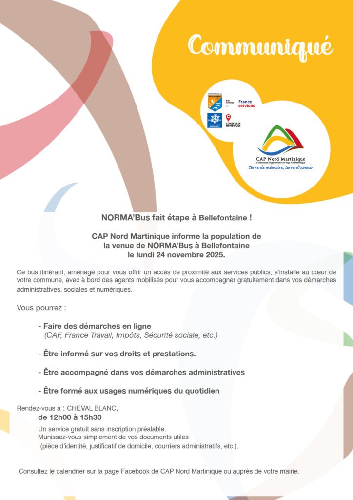 ✅ Pour vous, le NORMA’BUS, mis en circulation par CAP NORD sera à Bellefontaine une fois par mois jusqu’en janvier 2026.