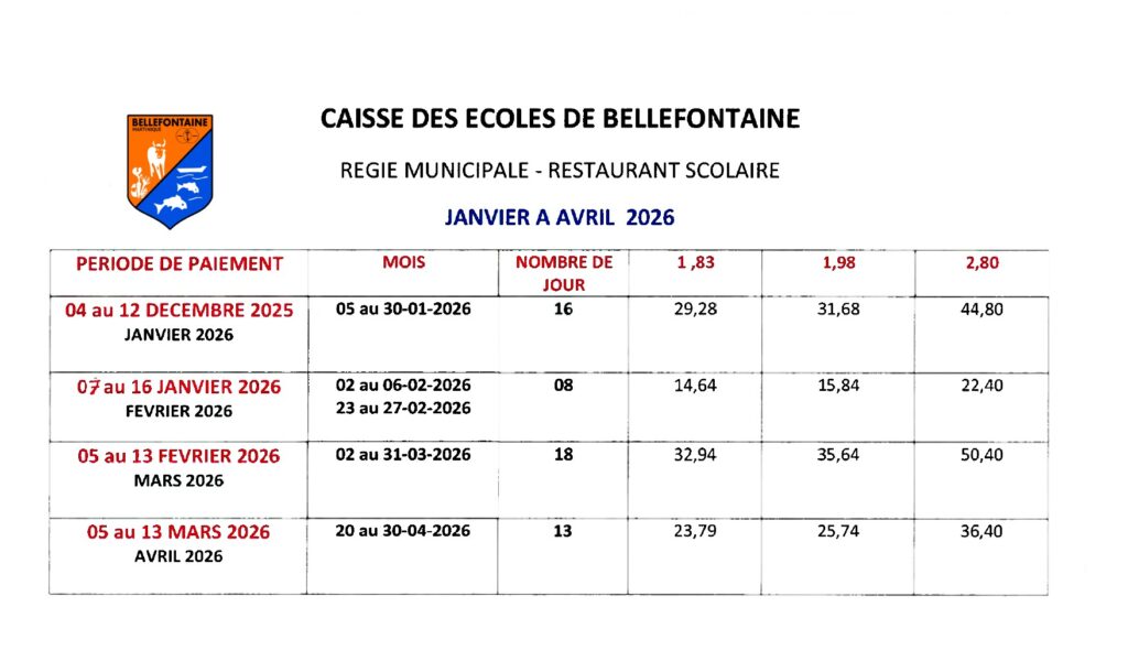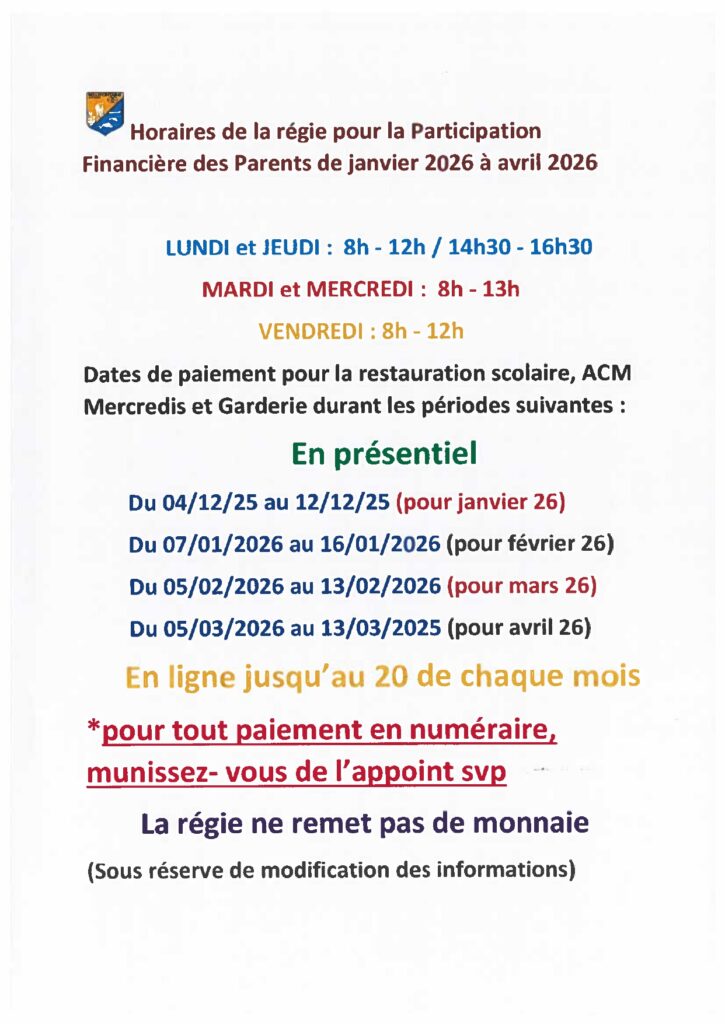 ACTUALITÉ : Régie – Périodes de paiement – de JANVIER à AVRIL 2026