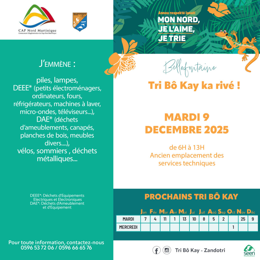 CAP Nord Martinique vous invite à mettre en pratique les gestes de tri, à respecter les consignes et les plannings de collecte afin de participer activement au maintien de la propreté sur le territoire Nord de la Martinique.