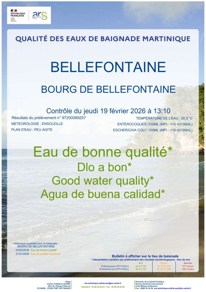 Pour une information en temps réel de la qualité des eaux de baignade en mer et rivière sur tout le territoire, vous pouvez consulter le site web de l’ARS Martinique :