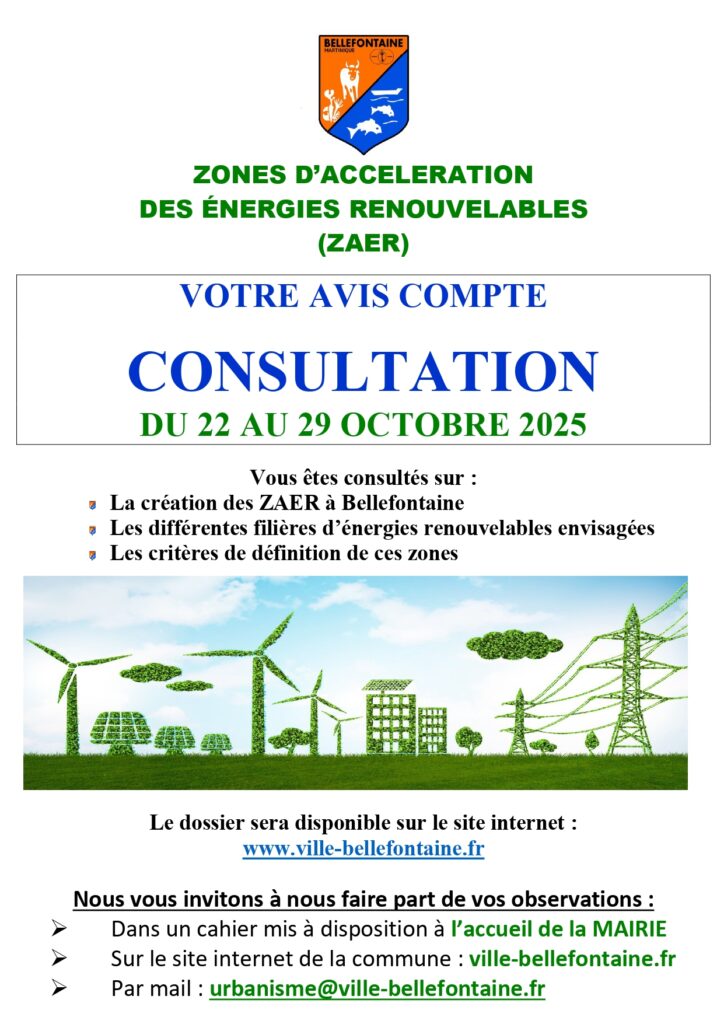 ☀️ Dans le cadre d’une démarche nationale visant à favoriser le développement des énergies renouvelables, Monsieur Le Maire, Félix ISMAIN, vous informe que la Ville de Bellefontaine lance une consultation publique afin de recueillir votre avis sur l’implantation des Zones d’Accélération pour la Production des Énergies Renouvelables (ZAER).