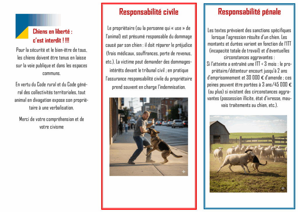 Il est rappelé que le propriétaire ou détenteur d’un chien est pleinement responsable des agissements de son animal.